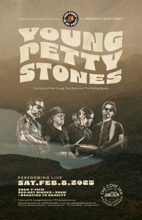 Join us for a rock show at The Cove on Saturday February 8th, 2025. The event is dinner and show from 7-11pm with Young Petty Stones and it supports the Ryan Marley cancer charity, His Fight is My Fight! Musical Nod to Neil Young, Tom Petty and The Rolling Stones.