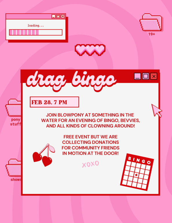 We'll be enjoying bevvies, playing bingo (did I mention there will be prizes?), and collecting non-perishable food/hygiene donation items for our friends at Community Friends in Motion! Admission is free but bring a donation or a tip if you can!