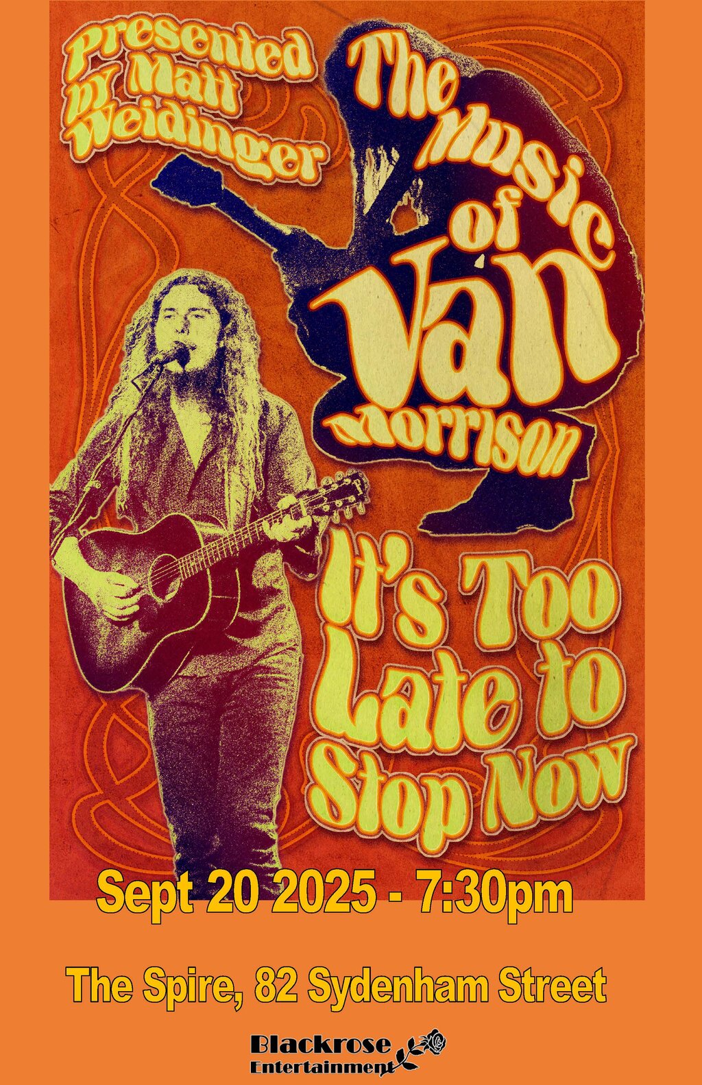 “It’s Too Late to Stop Now” is performed by a group of 7 highly experienced musicians lead by Matt Weidinger (soulful singer/songwriter and multi-instrumentalist). Joined on stage by his Hammond B3, they create an extraordinary evening which features music from many of Van the Man’s extensive song catalogue including some of Van’s early work to those of his later years.