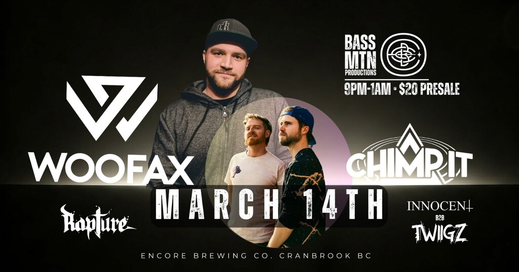 Bass Mtn Productions is proud to present Woofax and Chimp it, live from Encore Brewing Co. $20 pre-sale tickets are available now! Don't miss this rare double headliner night and make sure to arrive early, as we welcome Rapture back to Cranbrook and bring you a special b2b set from Innocent and TWiiGZ!