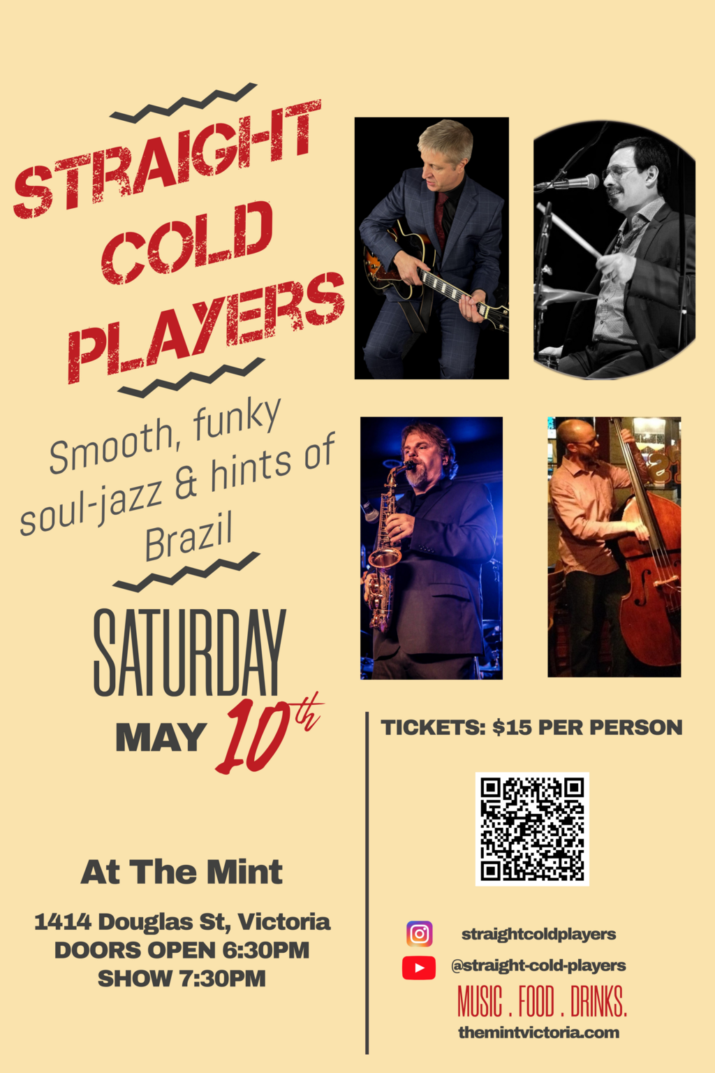 Straight Cold Players will bring their smooth, groovy soul-jazz with Brazilian seasoning for you listening pleasure in the cozy environment of The Mint in downtown Victoria. Tickets are $15 and limited in number so get 'em while they last!