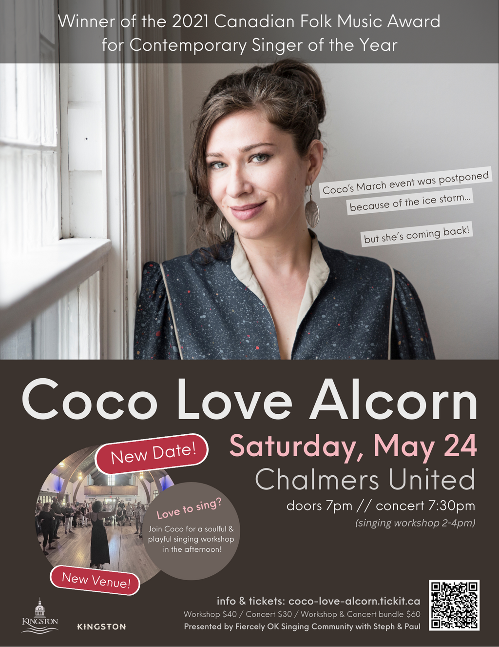 Recently awarded the 2021 Canadian Folk Music Award for Best Contemporary Singer Of The Year, Coco Love Alcorn combines diverse musical influences including jazz, R&B, pop, folk, and Gospel. Her love of improvising, and willingness to engage fearlessly with the audience has made Alcorn an established presence on the Canadian music scene. Alcorn’s career has spanned more than 30 years, 9 solo albums, many cross-Canada tours, collaborations, festival appearances, and award nominations.