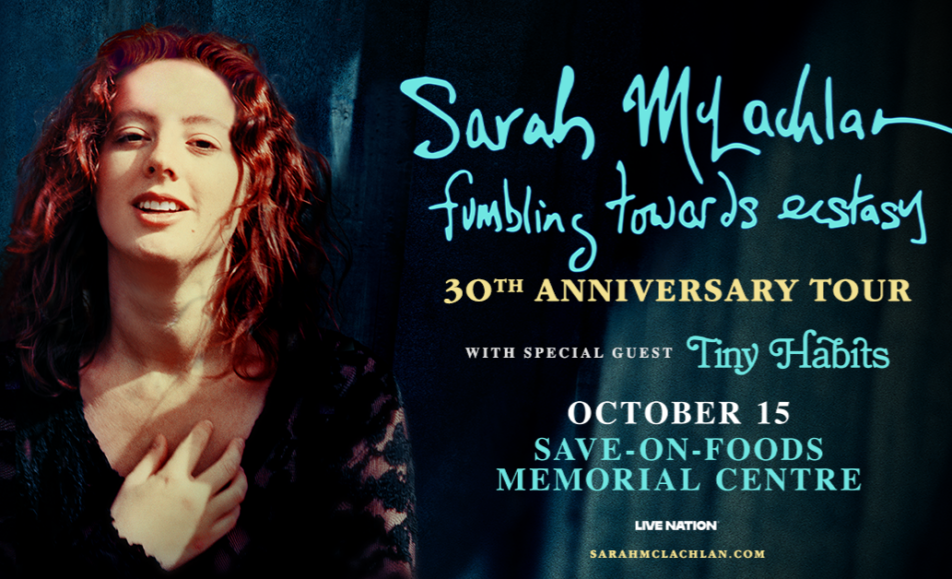 Celebrating three decades since the release of her multi-platinum third album, Grammy and Juno-award winning artist Sarah McLachlan announces the Fumbling Towards Ecstasy 30th Anniversary 2025 Canadian tour. Produced by Live Nation Canada, the tour, originally scheduled for 2024, will kick off its new 17-date run at Victoria’s Save On Foods Memorial Centre on October 15th. She will be joined by acoustic harmony trio Tiny Habits on all dates.