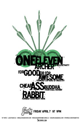 One Eleven Archer celebrating the release of their new CD, with For Good or For Awesome (formerly Captains of Industry), Cheap Ass Buddha (from Oslo, Norway), and Rabbit (formerly Good Night Irene). Killer show!