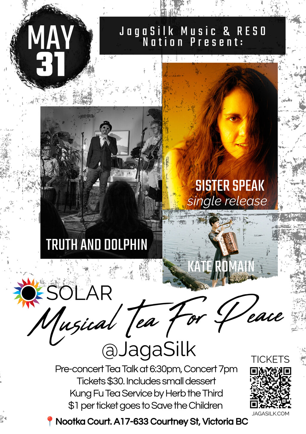 Reserve 1-4 people for the Solar Musical Tea For Peace VICTORIA event at JagaSilk. $30/per person includes specialty tea, dessert and live music by National, International and local acts in beautiful Nootka Court. Reservation of 2 seats or more guarantees a table. Kung Fu tea service by the Victoria Tea Society.