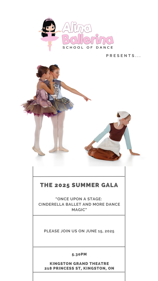 Step into a world of grace and enchantment as Alina Ballerina presents a magical evening of dance! Featuring a charming rendition of the Cinderella ballet alongside vibrant performances from our jazz, tap, contemporary, and acro dancers, this Summer Gala showcases the talent, heart, and imagination of our entire studio. A fairytale celebration for the whole family!