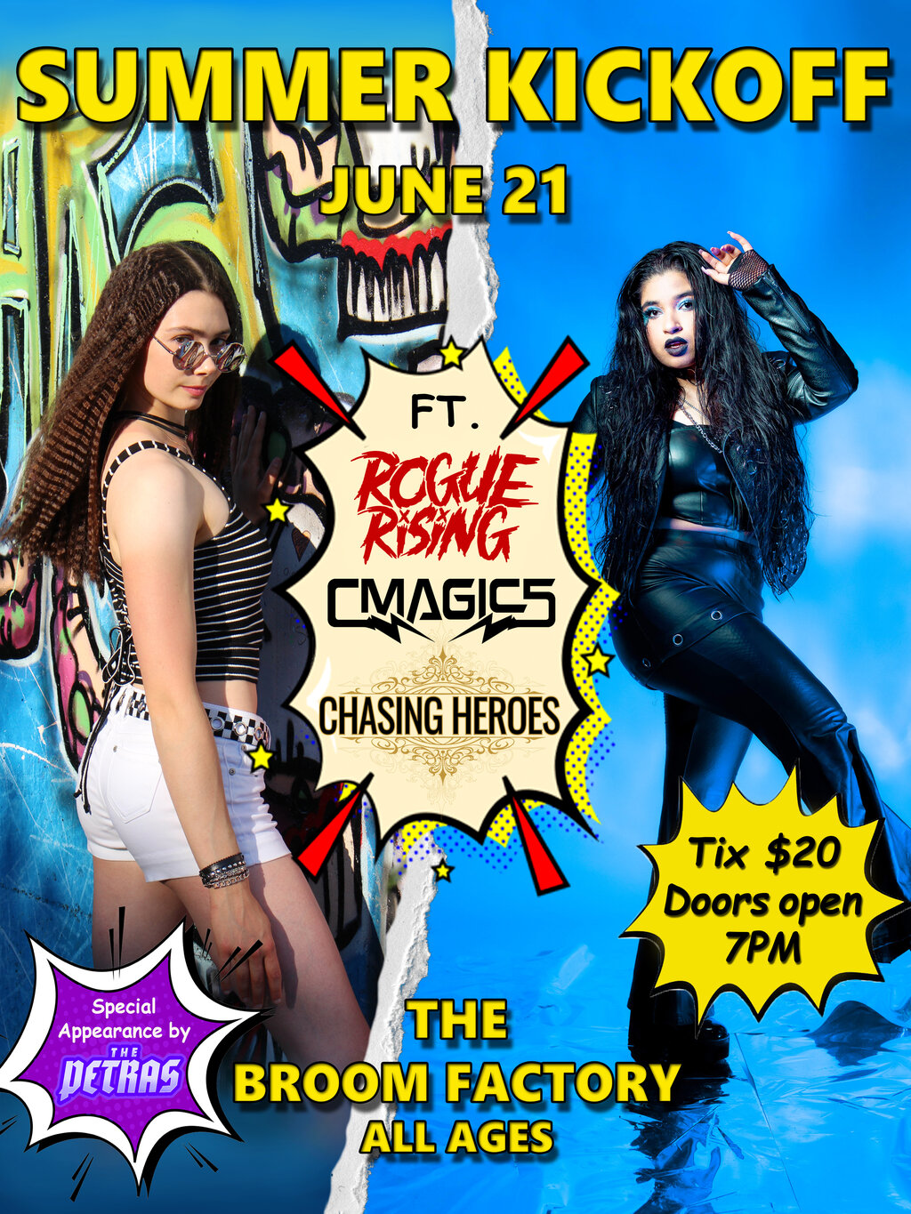 Join Rogue Rising, Cmagic5 & Chasing Heroes at The Broom Factory for a night of punk and pop rock! Special appearance by The Petras. Doors open at 7, show starts at 7:30. All ages welcome!