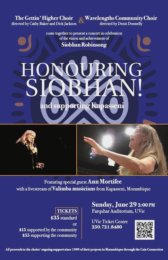 Ticket sales will go to the continued funding of the Caia Connection, a charitable organization here in Victoria that, through 26 years of fundraising concerts, has been supporting projects in Kapasseni, Mozambique and other initiatives in that region. Also joining us will be Perpetua Alfazema who worked together with Siobhan for many years to lift her home village of Kapasseni out of despair.