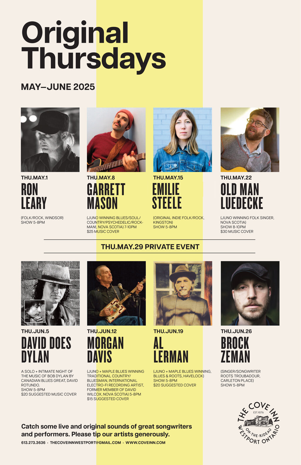 Singer songwriter Ron Leary’s smokey, rye-soaked voice is legendary throughout Ontario’s southern region. Best known for his fiercely honest approach to songcraft, Leary’s song narratives touch upon the politics of the day, the downtrodden, romance and joy. Few have captured the spirit of Canada’s deep south in song better. For some Singer/songwriter, Ameri/Canadiana, Indie Folk, come Thursday, November 27, 2025 5-8pm.