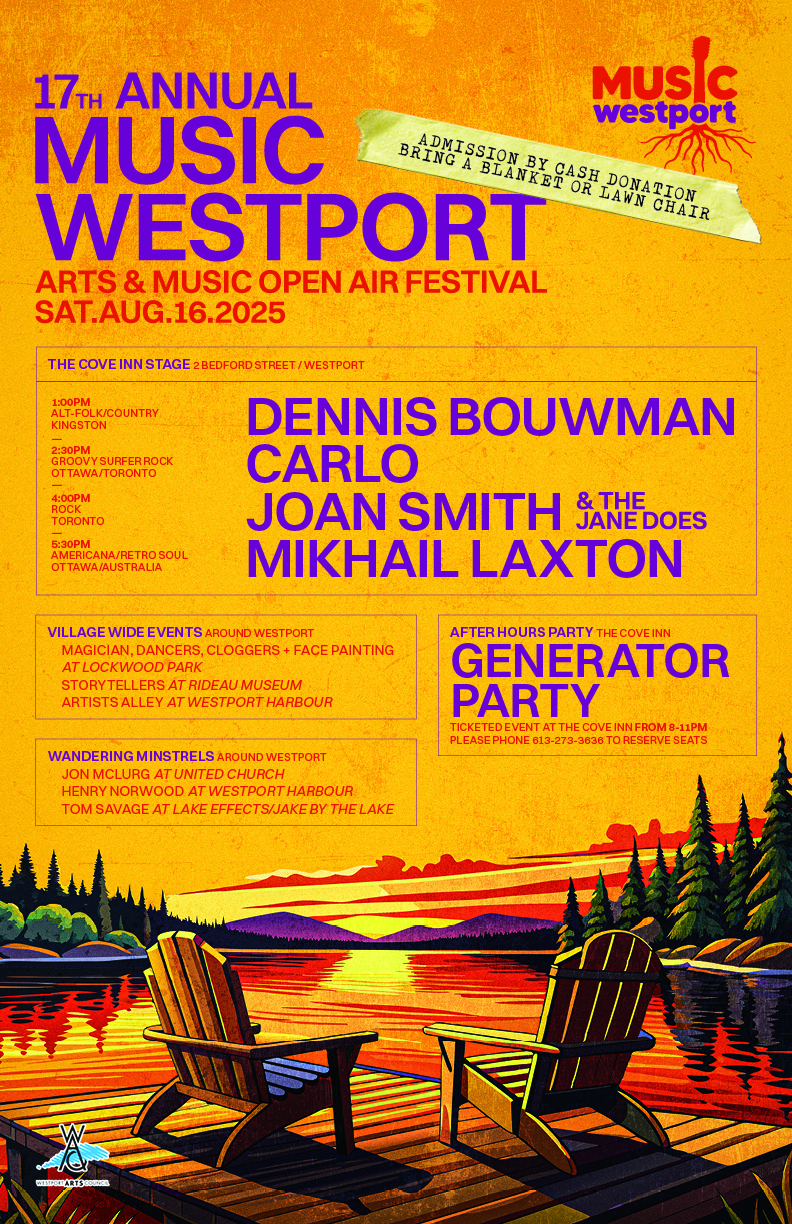1:00 pm Dennis Bouwman (alt-Folk/Country, Kingston): A true blue colour songsmith. Bouwman writes and sings with a gritty honesty rarely seen these days. Be it with or without his band, Bouwman’s combination of heart-wrenching lyrics, warm melodies, and a voice like the bottom 10 pipes on a church organ is sure to captivate you and make you feel.