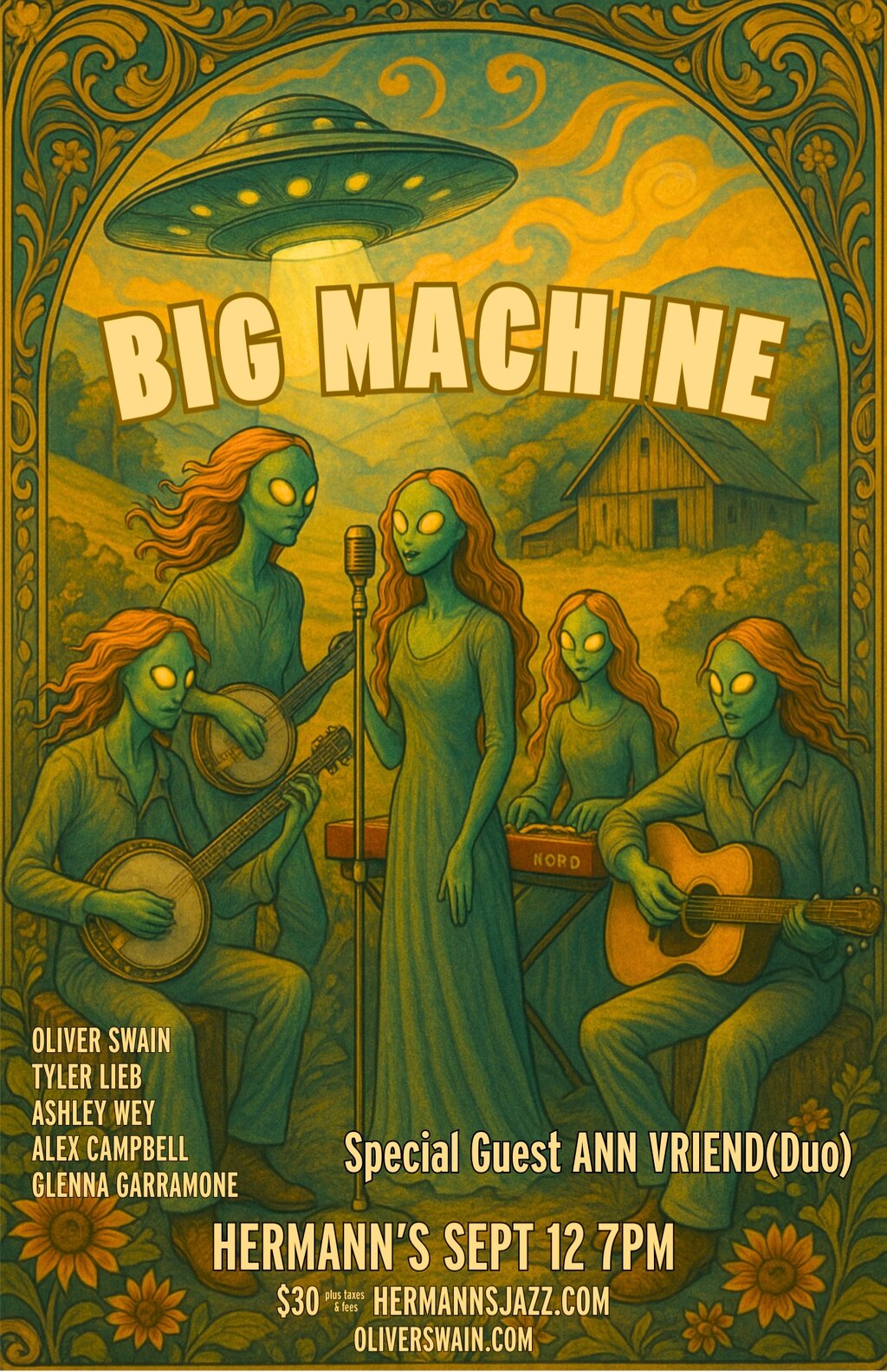 Two-Time Western Canada Music Award Winner and Juno Nominee Oliver Swain leads BIG MACHINE, an all-star lineup of artists featuring elements of Bluegrass, Psych-Rock, Old-Time, Jazz and modern Songwriting. From his early days travelling the Appalachian Mountains and Mississippi Delta to touring the world with some of North America's most loved roots bands, The Bills, The Duhks and Outlaw Social(Pharis Romero), Swain has explored the depths of Americana music and written songs that experiment with the palette in surprising ways.