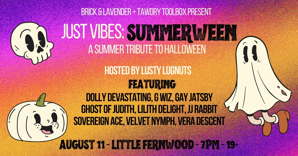 Just Vibes: Summerween Presented by Tawdry Toolbox Brick & Lavender Monday, August 11 Doors @ 6PM / Show @ 7PM Little Fernwood (1923 Fernwood Rd) 19 Tickets $15 presale / $20 door https://JustVibesSummer.eventbrite.ca Let's go ghouls! Already dreaming of pumpkins, skeletons and candy corn? We're bringing some thrills and chills on August 11 for the next Just Vibes show: Summerween 🎃 Just Vibes is a show created to spread community joy and giggles in these stressful times. 💝 This time we're celebrating with gay Christmas (Halloween) in the middle of summer. Get wicked with a night of ridiculous drag and burlesque. Hosted by Lusty Lugnuts Featuring: Dolly Devastating G Wiz Gay Jatsby Ghost of Judith Lilith Delight JJ Rabbit Sovereign Ace Velvet Nymph Vera Descent This is a sober show! Eves of Destruction roller derby will have non-alcohol bevvies, homemade baked goods and snacks for sale at the concession. ------------------ COVID-19 Safety: *As capacity for guests is reduced for safety, we encourage you to purchase your tickets online to ensure you can join us. Any remaining space will be sold at the door. *Masks are encouraged, especially when moving around the space. Please respect everyone's safety and comfort and continue to social distance. Land Acknowledgement: This show is happening on the traditional and stolen lands of the W̱SÁNEĆ and Lekwungen peoples, known today as the Songhees and Esquimalt First Nations. We are committed to working towards decolonization. Accessibility: *Little Fernwood (Paul Phillips Hall) is accessible for those with mobility devices, with an accessible restroom. *Scent free space! Please respect those with scent sensitivities and refrain from wearing perfume or heavily scented products. *There will be amplified sound via microphone and speakers. Lighting overhead or directed at the stage with no coloured or flashing lights. *There is street parking available, as well as bus stops less than one block from the hall. Please reach out to us to discuss accessibility if needed! This show is a space for LGBTQ art. Allies are welcome to join us, please respect the artists and community. There is zero tolerance for racist, homophobic, transphobic, fatphobic, ableist or sexist behaviour.