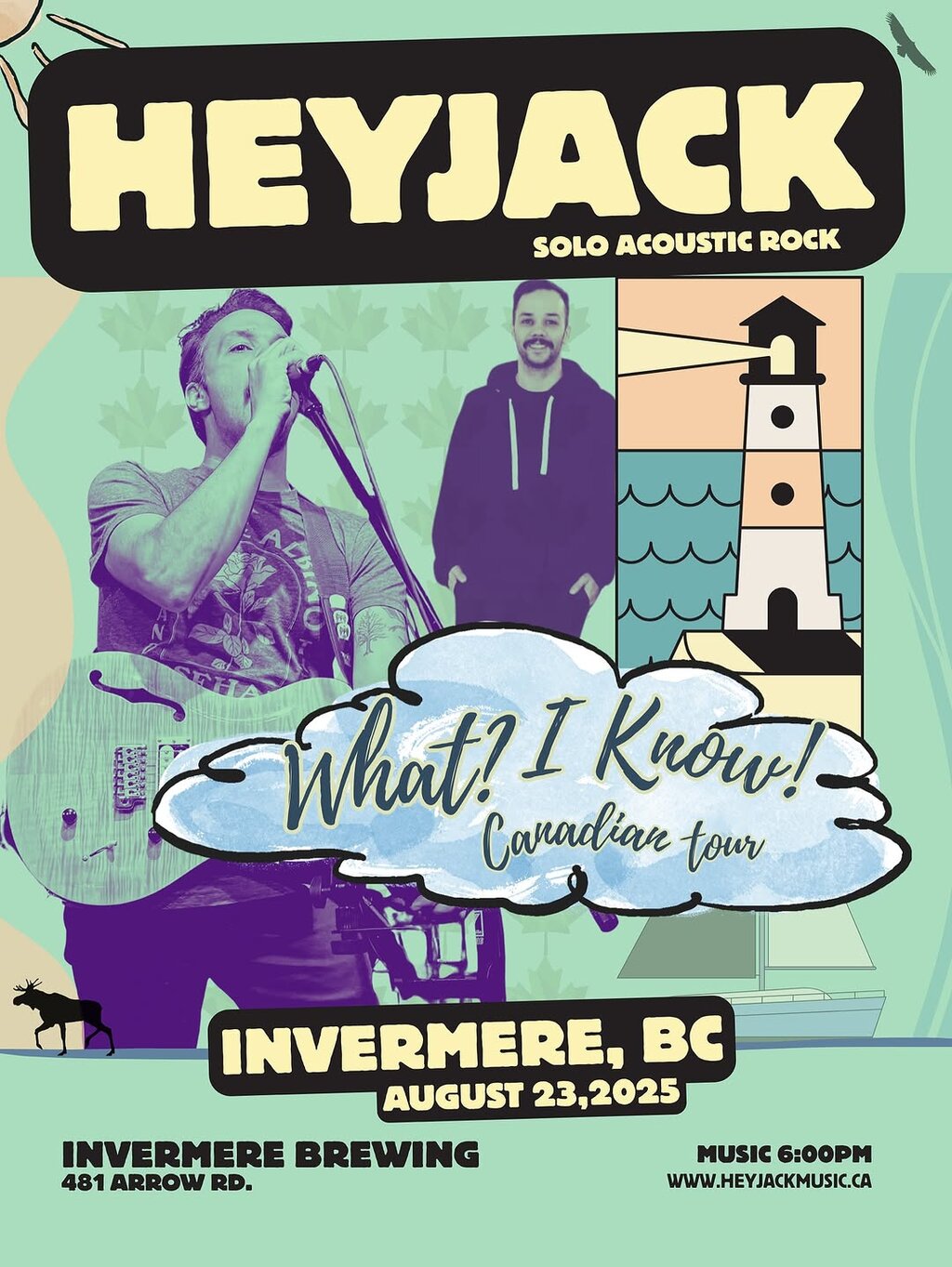 HEYJACK brings his "What? I Know!" Canadian Tour to Invermere Brewing on Saturday, August 23rd for an epic Solo Acoustic Rock Show! Swing by for an evening of great live music, vibes, and cold beer!
