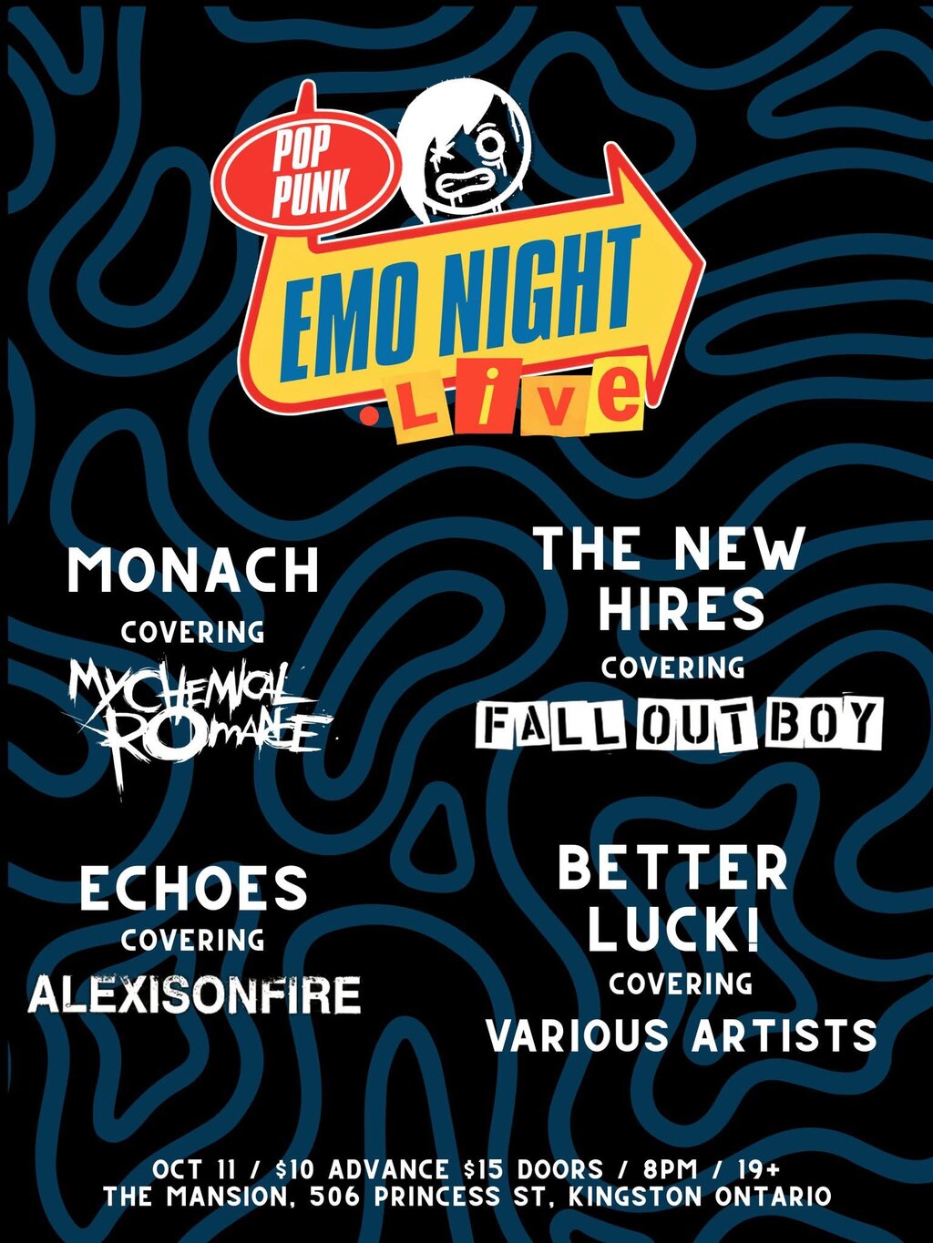 We had so much fun last year, we're doing it again! Pop Punk Emo Night is going live again for October with four bands covering your scene faves. Get your skinniest jeans and fingerless gloves on - it's all going down live at the Mansion. Tell all your friends, it's gonna be a show to remember.