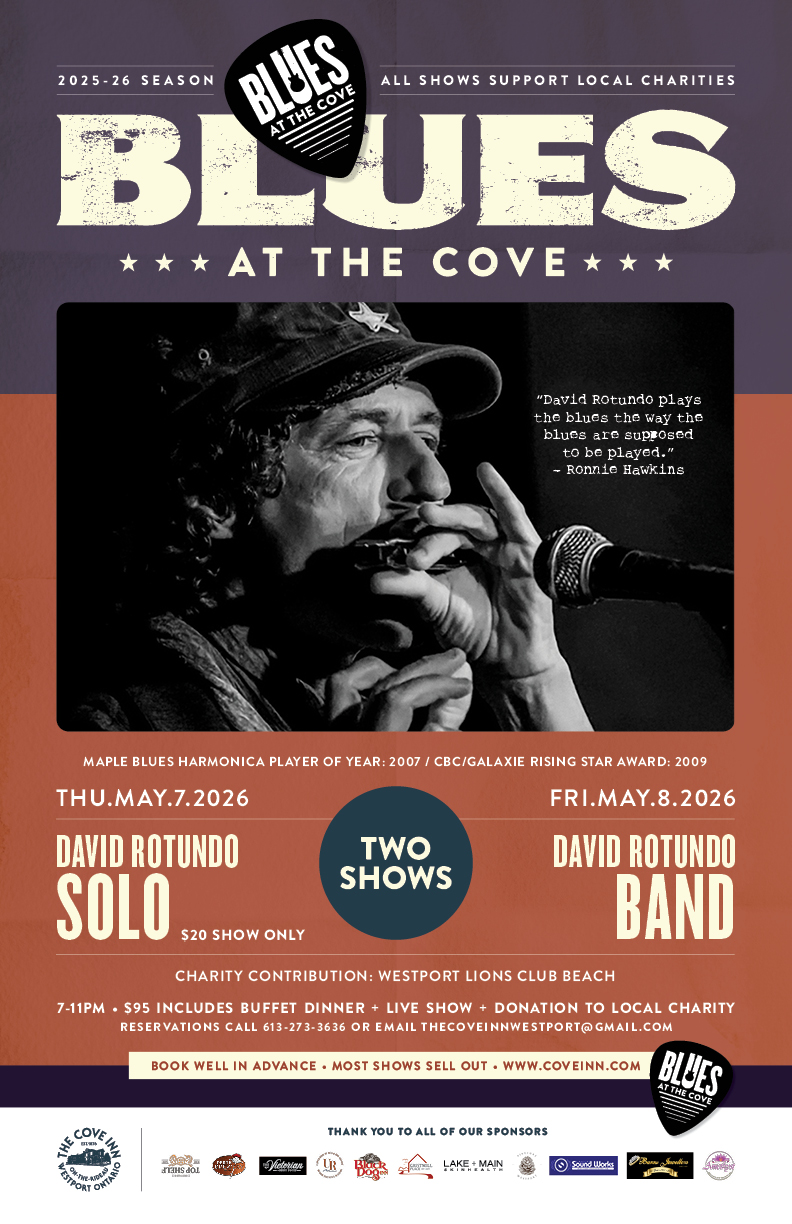 The continuously popular Blues at The Cove series returns to The Cove Inn with an annual but rare performance by the David Rotundo Band from Toronto/Mexico! Enjoy a Blues at The Cove Series show with delicious dinner, world class music and support for local charity from 7-11pm on Friday, May 8th, 2025! He will also be playing a solo acoustic night of music on The Cove Patio in tribute to the greatness of Bob Dylan! That will be on Thursday, May 7th from 5-8pm with a $20 Music Cover.