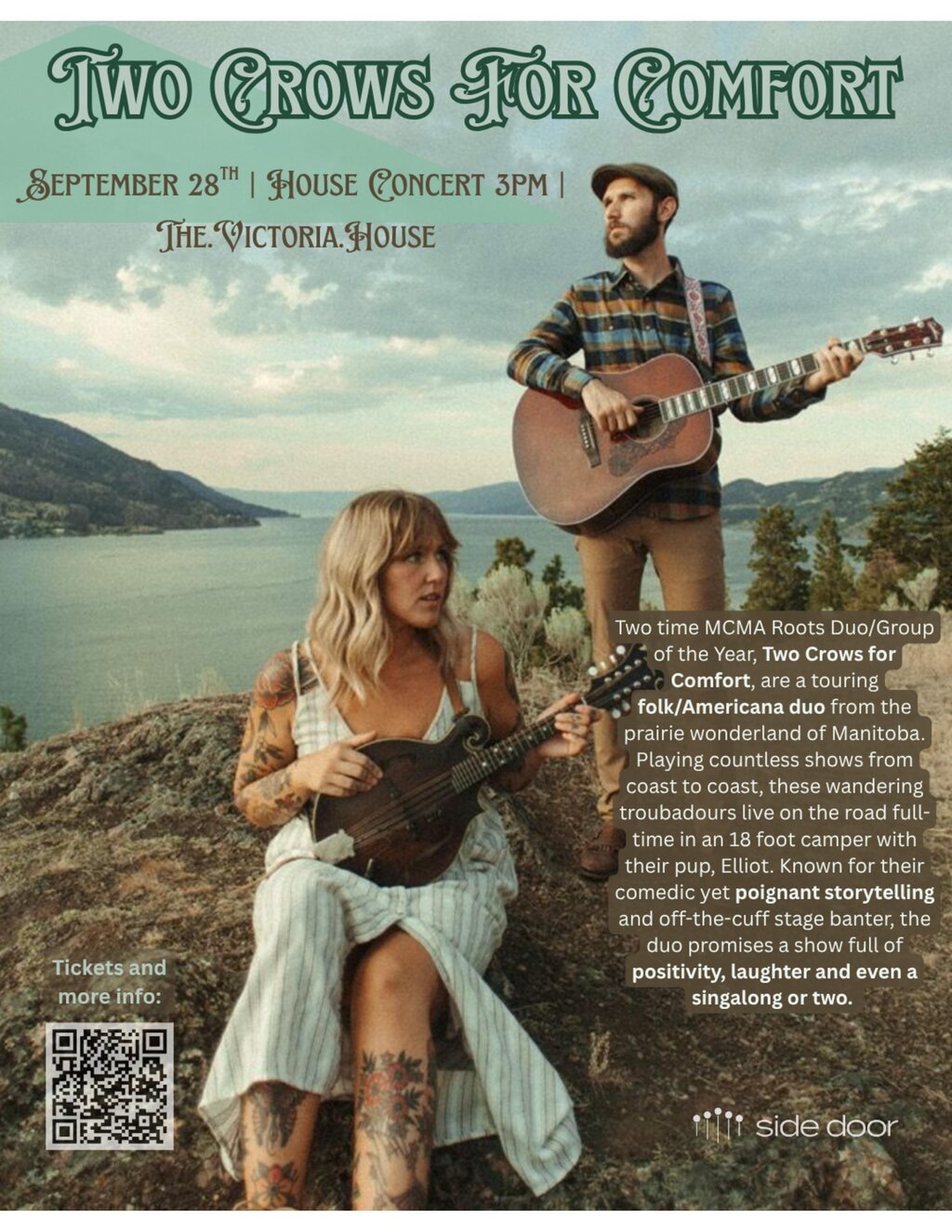Join us for a fall Sunday matinee house concert with Two Crows for Comfort, a touring folk/Americana duo from the prairie wonderland of Manitoba.