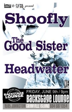 Friday, June 9th IMU & CiTR 101.9FM present Shoofly, The Good Sister & Headwater @ The BACKSTAGE LOUNGE, 1585 Johnston Street, Granville Island . 9pm / $10 -:- Info: 604 687 1354