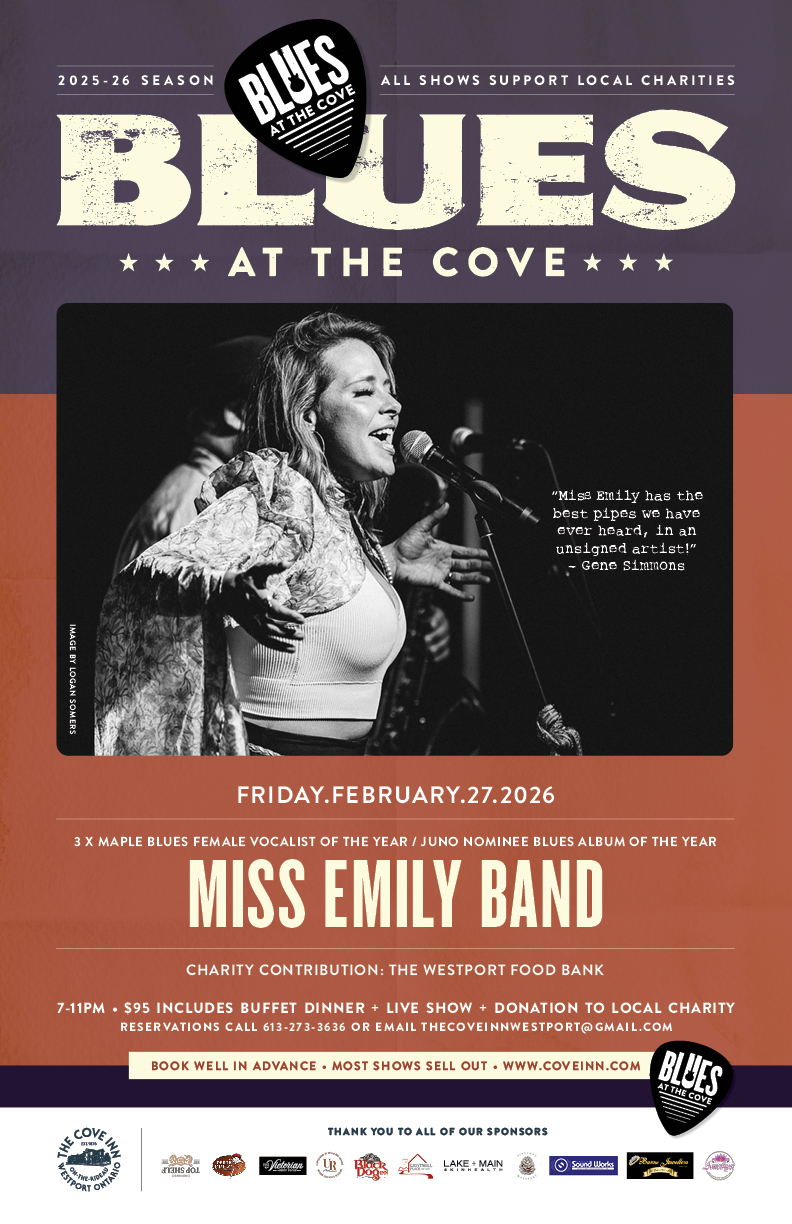 Immerse yourself in the intoxicating soul sound of Miss Emily as she takes you on a dynamic ride of ups, downs and all arounds. Enjoy a Blues at The Cove Series show with delicious dinner, world class music and support for local charity from 7-11pm on Friday, February 27th, 2026!