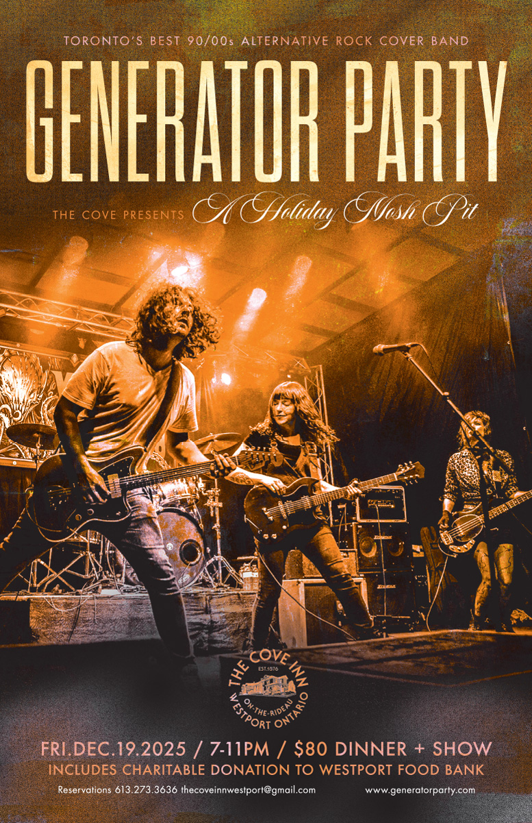 Come out to The Cove Inn on Friday December 19, 2025 for a holiday mosh pit with an amazing rock and roll experience with Toronto’s Best 90’s Grunge Rock cover band Generator Party! $80 per person, 7-11pm for Dinner, Show Westport Food Bank Charity.