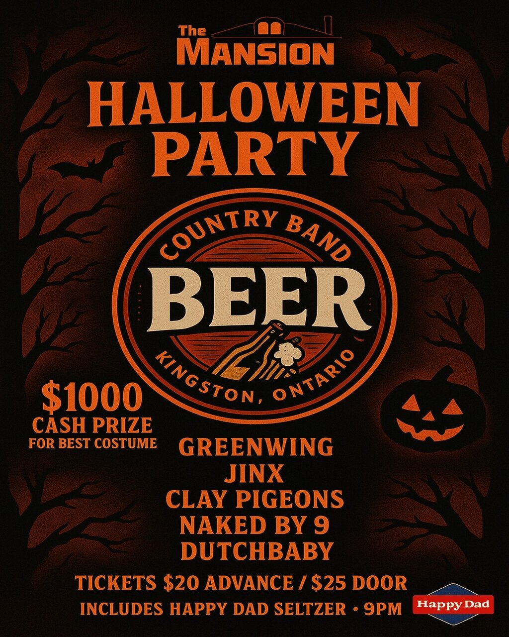 Annual Haunted Mansion Halloween Party featuring performances by Beer, GreenWing, Jinx, Clay Pigeons, Naked by 9, and DutchBaby. There is a $1000 cash prize for best costume and the event is sponsored by Happy Dad. Tickets are $20 in advance and $25 at the door and includes a free Happy Dad Seltzer. Doors at 9PM