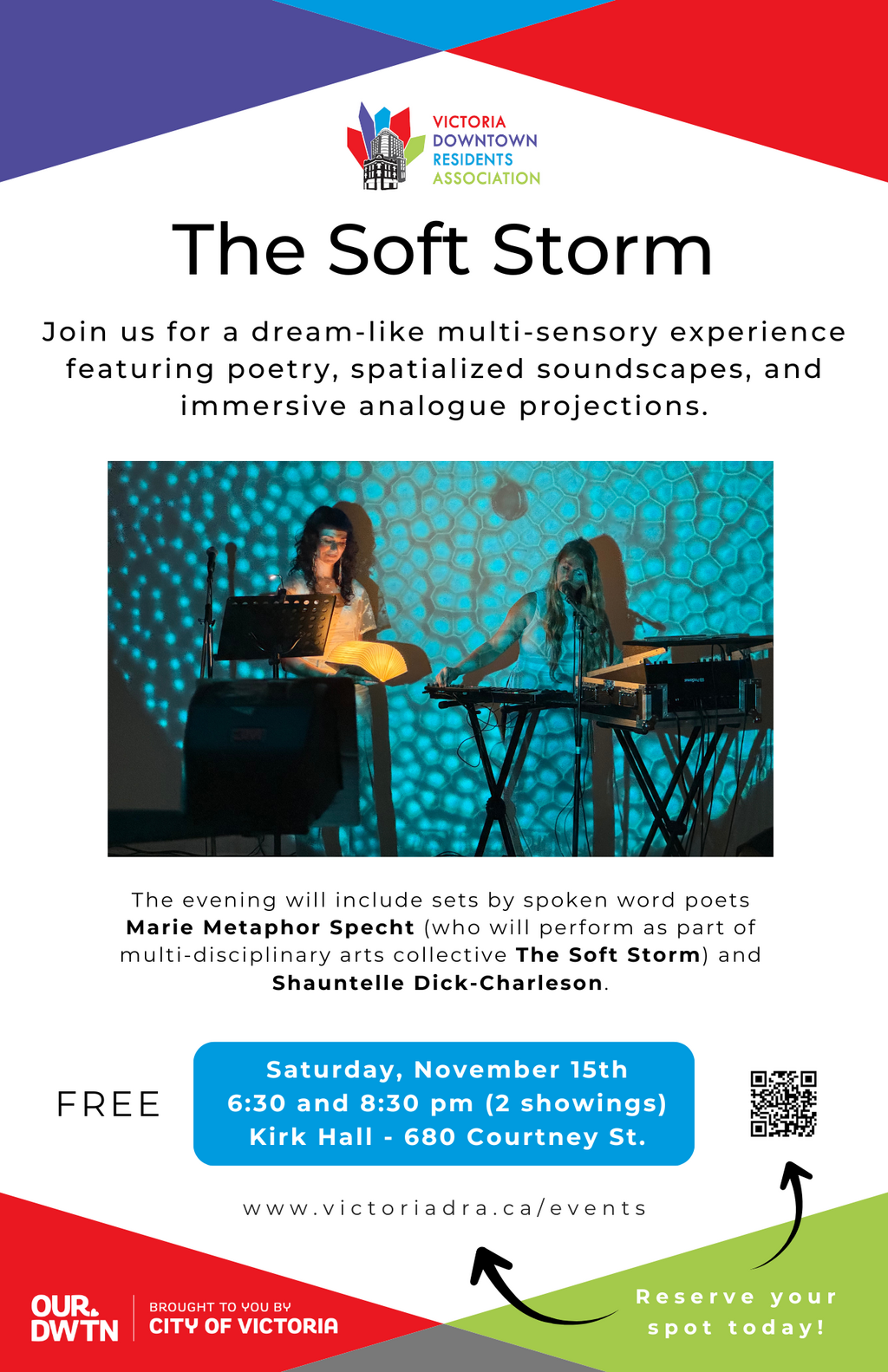 Join the Victoria Downtown Residents Association for a dream-like multi-sensory experience featuring poetry, spatialized soundscapes, and immersive analogue projections. The evening will include sets by spoken word poets Marie Metaphor Specht (who will perform as part of multi-disciplinary arts collective The Soft Storm) and Shauntelle Dick-Charleson.