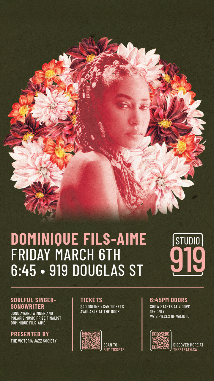Fils-Aimé has appeared on the same bill with Allison Russell, Melody Gardot, Diana Krall, Ibrahim Maalouf and more. With a magnetic stage presence inspired by Nina Simone and Martin Luther King Jr., she moves from vintage jazz to trip-hop to sultry soul jams, even touching on reggae and R&B with confident style. She last appeared in Victoria in February 2024 in an unforgettable performance and will release a new album in February 2026! Experience her ascendant journey, as Dominique Fils-Aimé becomes one of Canada’s most poignant, soul-stirring artists. Don’t wait – get your tickets early!