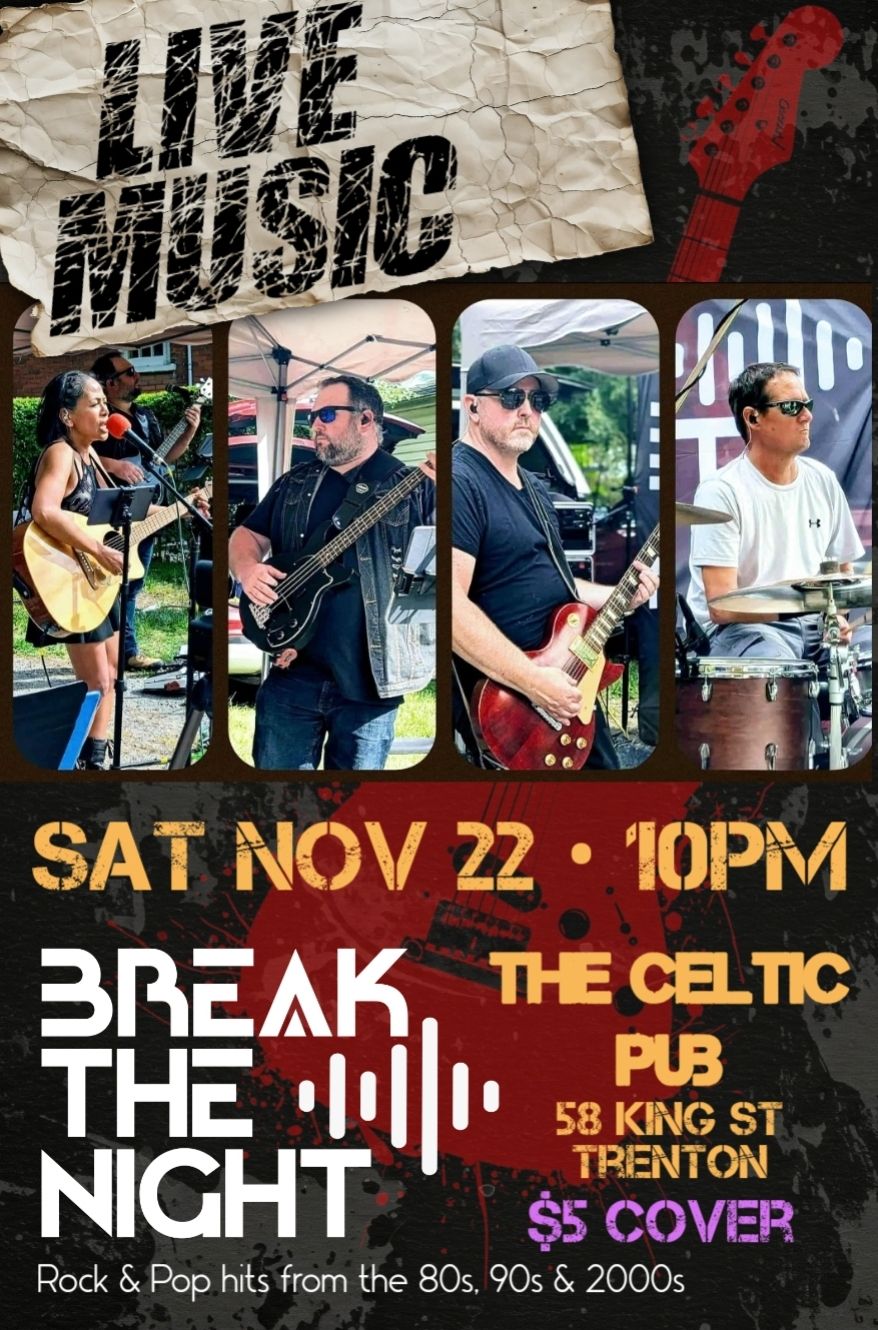 Join us for a night of the best rock and pop hits from the 80s, 90s & 2000s when Break The Night hits the stage at The Celtic Pub. You wont want to miss this one! Its going to be a party!