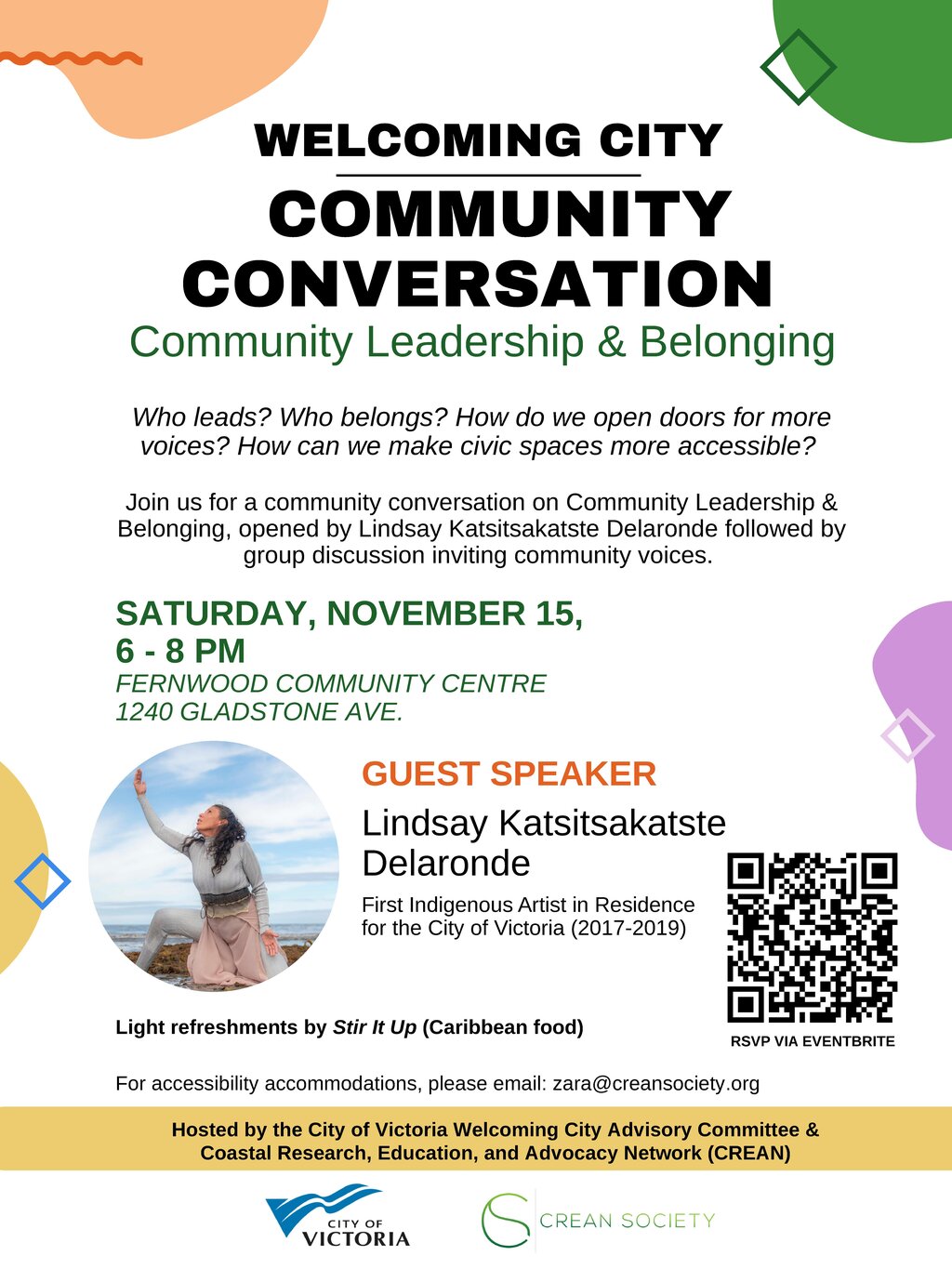 Hosted by the City of Victoria’s Welcoming City Advisory Committee in partnership with the Coastal Research, Education, and Advocacy Network (CREAN), this Welcoming City Community Conversation explores what leadership and belonging means in community spaces. This conversation builds upon the Welcoming City Standards and Strategy.
