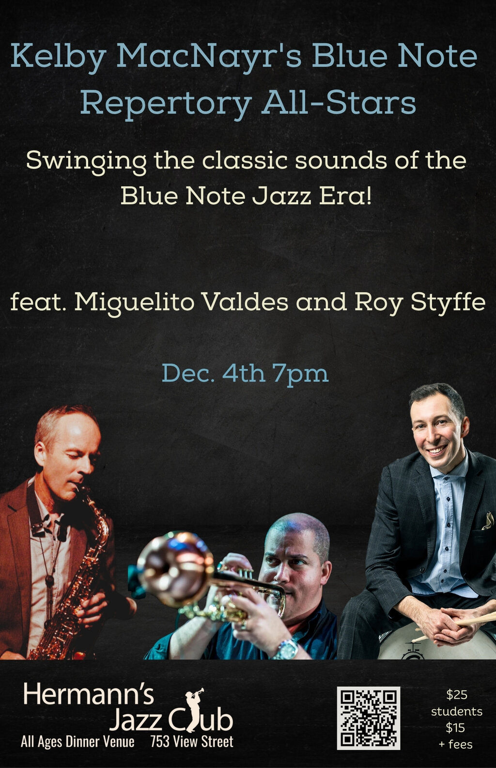 Kelby MacNayr's Blue Note Repertory All-Stars features Cuban trumpet sensation Miguelito Valdes, the lyrical saxophonist Roy Stffe, pianist Dr. Tony Genge and explosive drumming of Kelby MacNayr! and MORE!