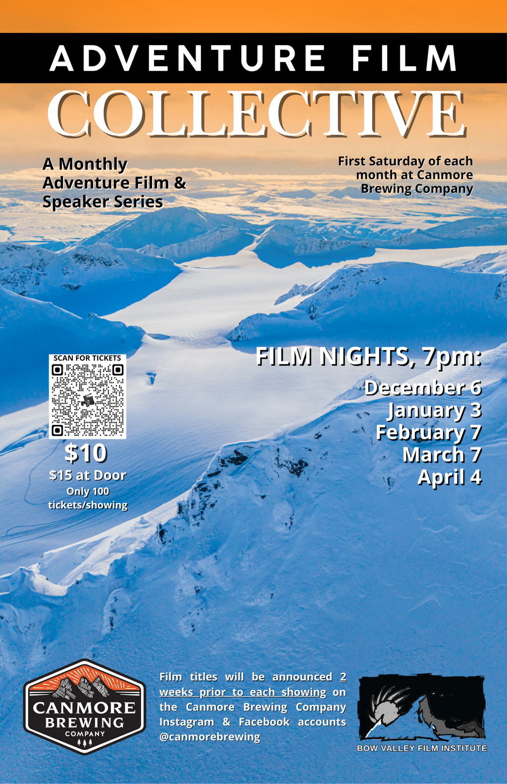 Join us at Canmore Brewing Company for an exciting monthly adventure film & speaker series, happening the first Saturday of every month, December through April.