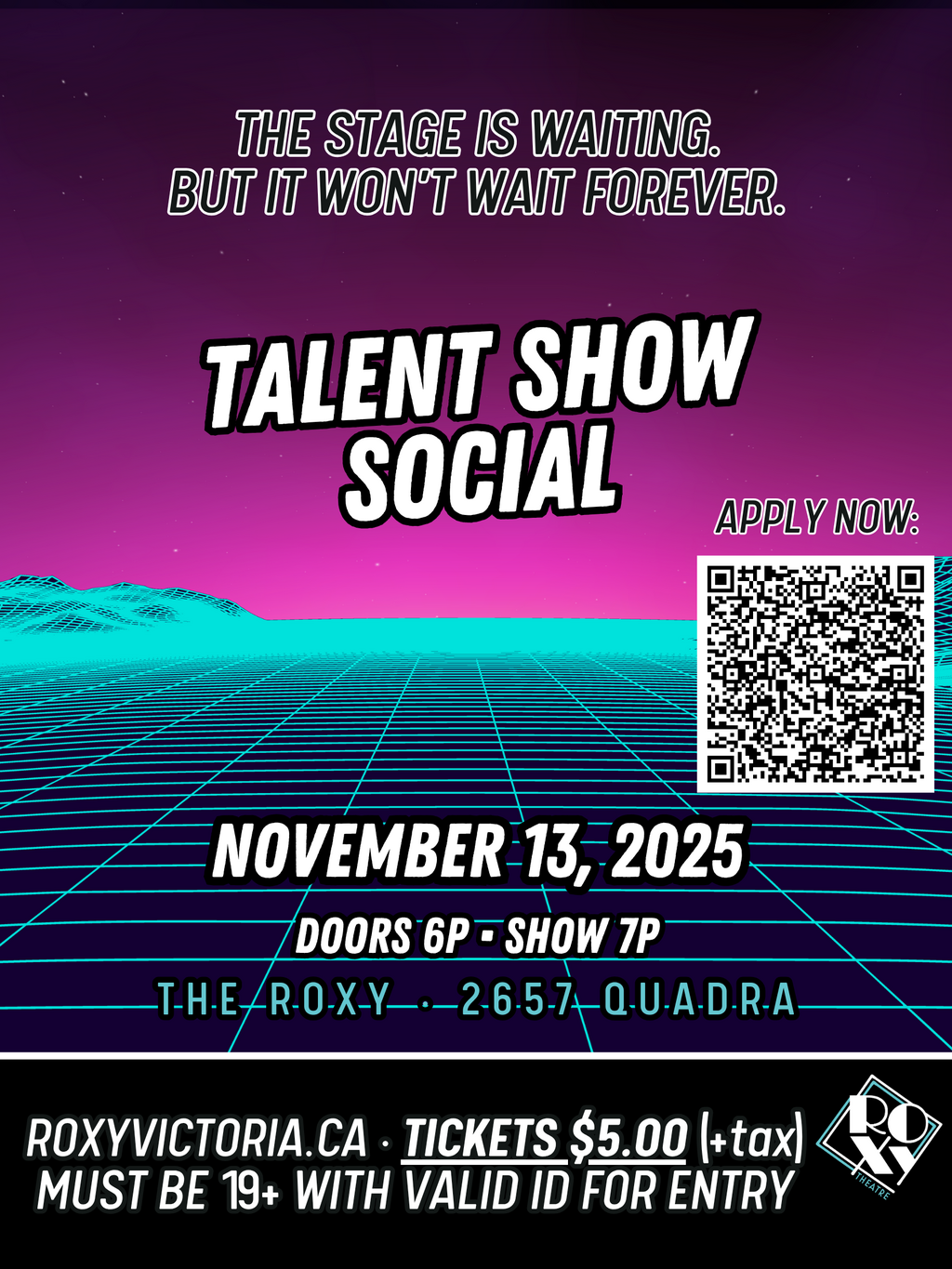 Join us for a night of unforgettable entertainment, creativity, and community at The Roxy Theatre's Talent Show Social! Whether you're showcasing your unique skills or cheering from the crowd, this is your chance to connect, celebrate local talent, and enjoy an evening full of surprises. From music and comedy to magic and more, our stage is open to all kinds of performers ready to shine. Show up early or stick around after the show to mingle, enjoy refreshments, and soak up the vibrant atmosphere.