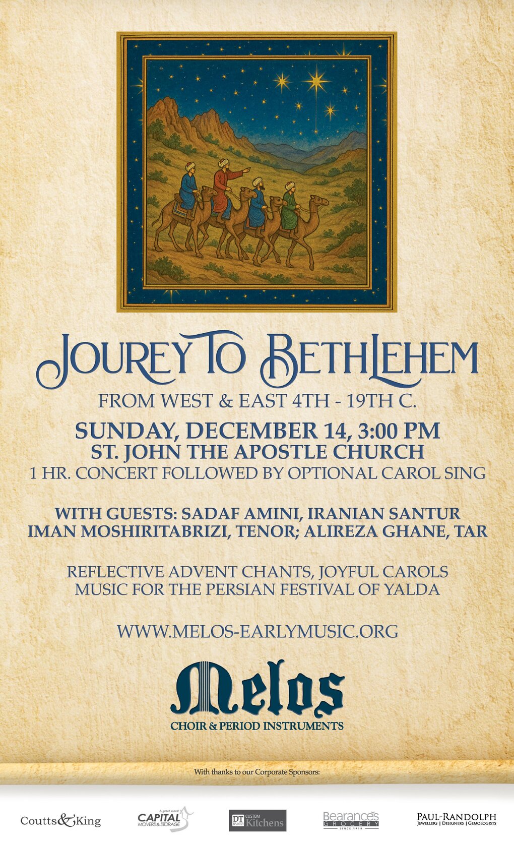 Melos & friends perform ancient chants, motets & traditional songs for Advent, Christmas & Yalda, carrying us on a journey through the season's darkness to new light. This 1-hour program is followed by a brief break, then an optional Carol Sing.