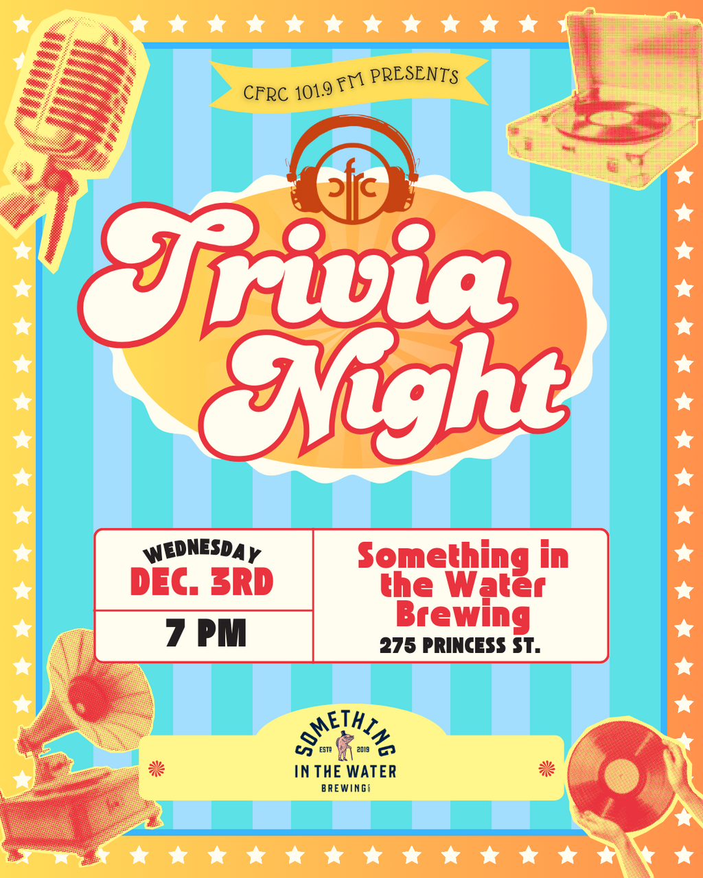 Join CFRC 101.9 FM on December 3rd at 7 PM for a free Trivia Night at Something in the Water Brewing (275 Princess Street) Four rounds of fun led by Shari & Terry, hosts of the beloved CFRC radio program, 30 Years of Nonsense! Lots of prizes, music and laughter! Come join in the fun with your friends! See you there!