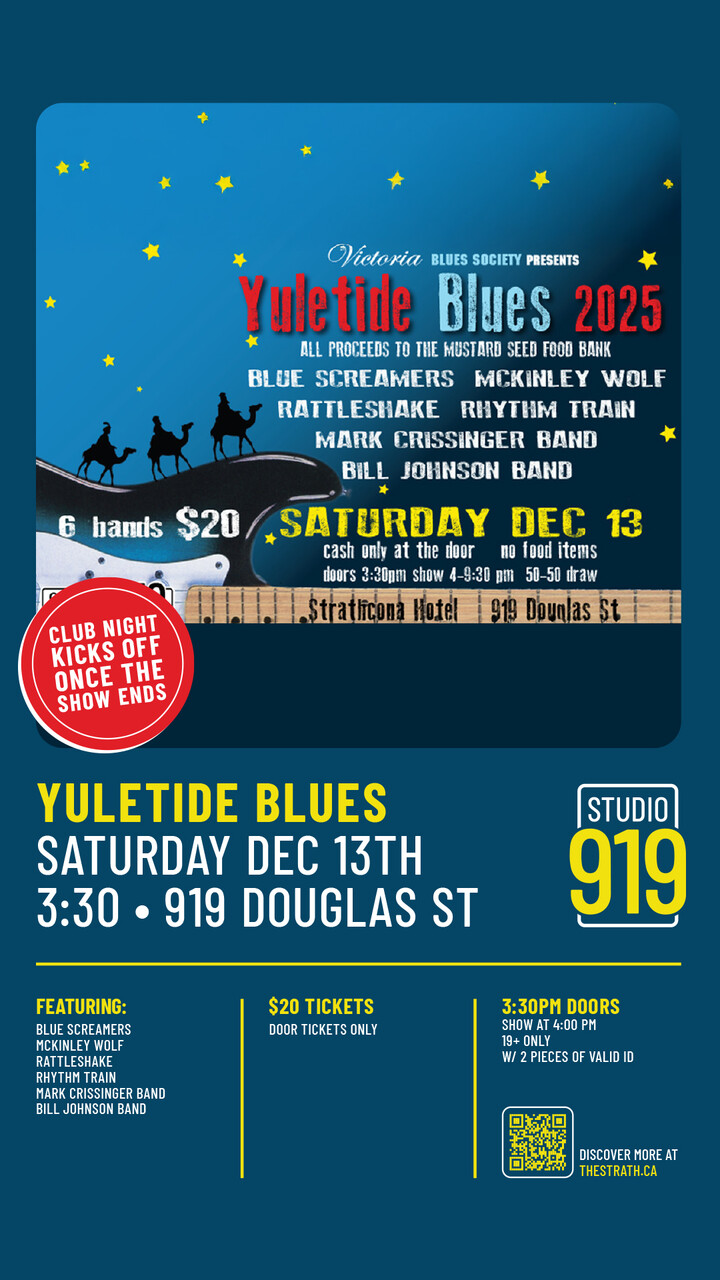 This December, warm up your winter nights with an unforgettable afternoon of live blues — all for a great cause! The Victoria Blues Society invites you to Yuletide Blues 2025, happening Saturday, December 13th at the Strathcona Hotel’s Studio 919 (919 Douglas St.).