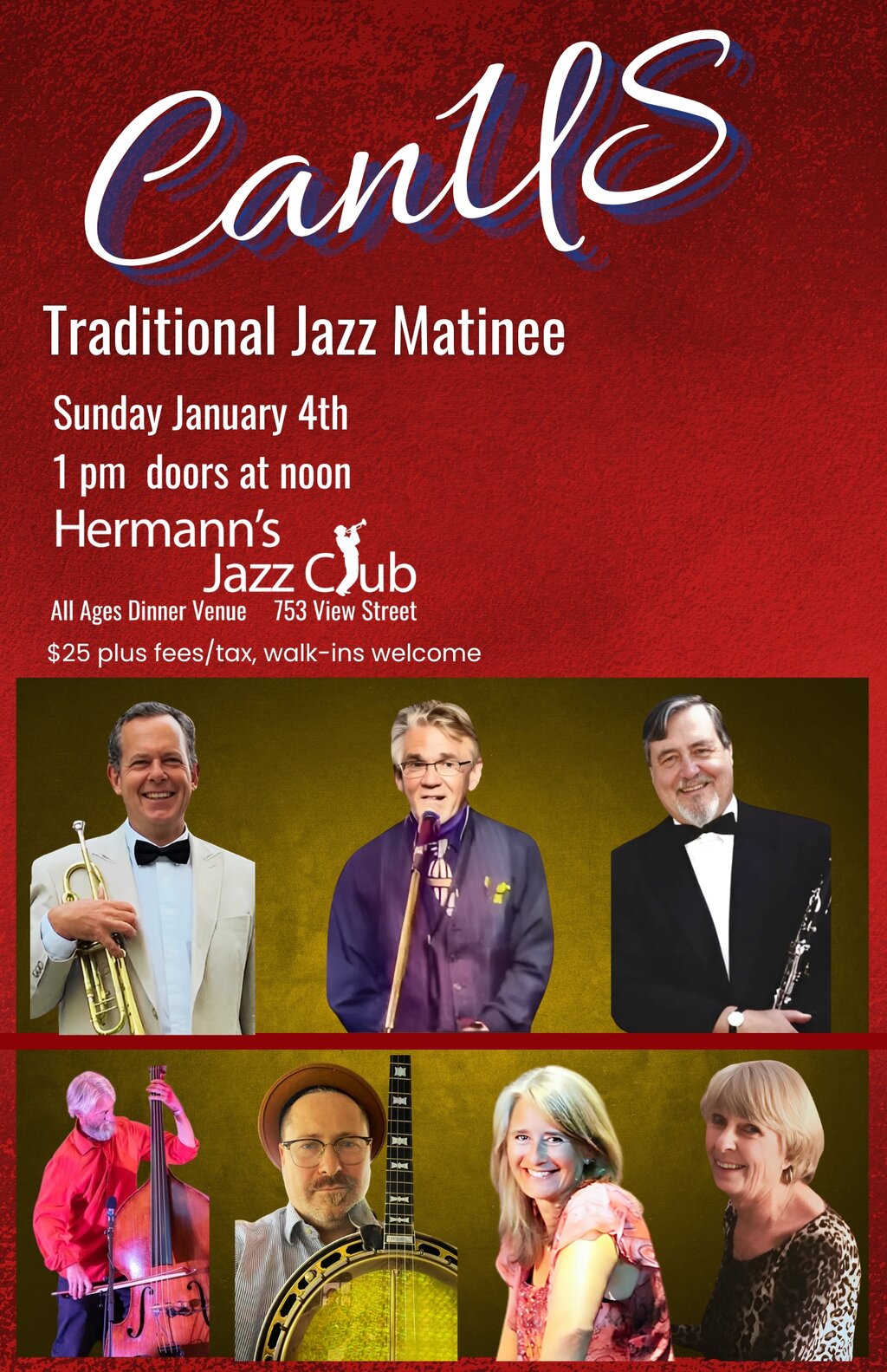 Trumpet played by Simon Stribling adds that Aussie joy in bringing you those loved melodies, with the addition of some vocals, boosted by the Benny Goodman-esque clarinet of Al Pease, also on tenor sax in that beautiful Coleman Hawkins style. Doug Rhodes is on alto sax and vocals, featured on 5 of the 8 CanUS CDs, all of which you can hear on YouTube. Avram McCagherty brings a sparkle to any of the many bands he leads, and we get to enjoy him, too. His banjo and vocals are a treasure for our city, and the amazing bass player Scott White, along with Laurie Lyster, fabulous on the drums and vocals, too. And to finish and embellish is the early jazz piano style & vocals of Toni Blodgett, leader.