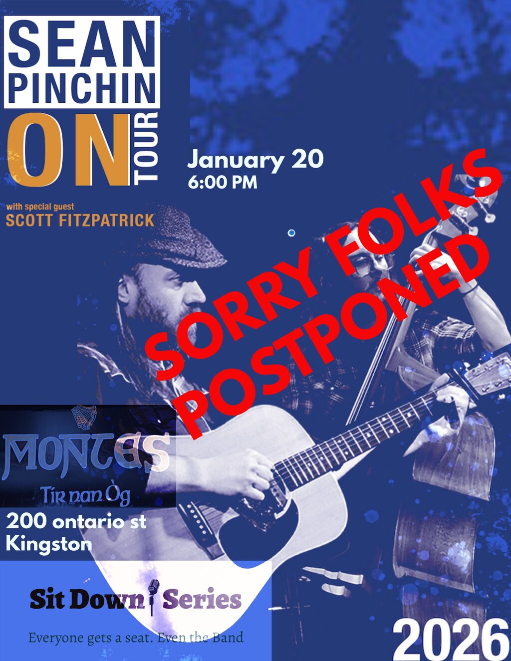 So so sorry everyone. Due to this awful weather and the long road to Sudbury we want to support Sean and Scott's safety and agreed to use today as a travel day there so they can be "On the road next year " as my buddy Rick Scott always says. Aint that correct Deana Ketcheson ? Please accept my sincerest apologies to all who supported with advanced sales. Sean has promised us a return date to be determined soon. I will process refunds immediately .