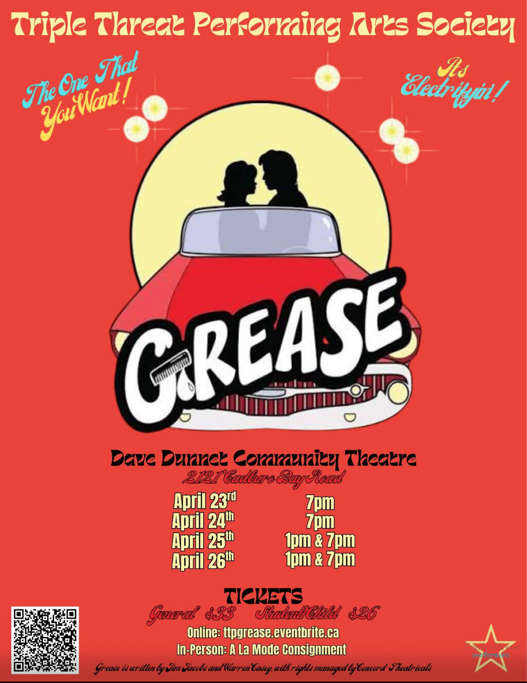 Welcome to GREASE Presented by Triple Threat Performing Arts Society! Get ready to experience the magic of live theater at the Dave Dunnet Community Theatre from April 23rd to 26th, 2026. Join us for an unforgettable evening filled with music, dance, and laughter. Don't miss out on this iconic show that will transport you back to the 1950s with its catchy tunes and heartwarming story. Grab your friends and family for a night of entertainment you won't soon forget.