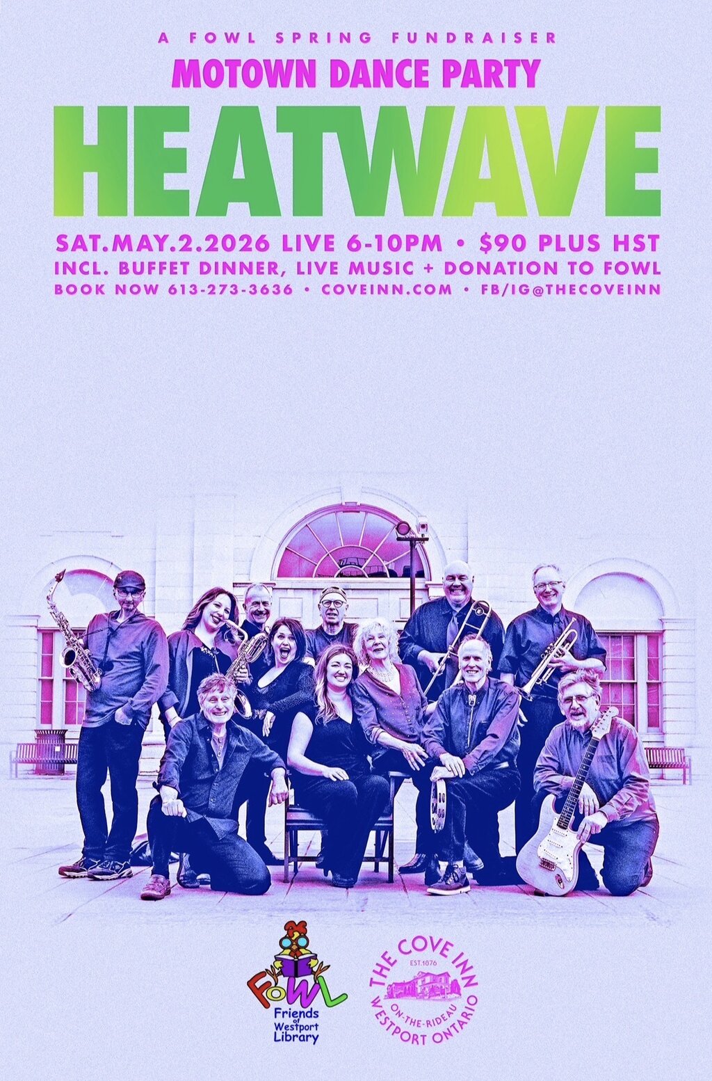 Visit The Cove Inn on Saturday May 2nd 2026 to dance and sing to the music of Heatwave: A Motown Dance Party in support of Friends of Westport Library, FOWL! Dinner, show and charitable donation tickets for $90 HST per person.