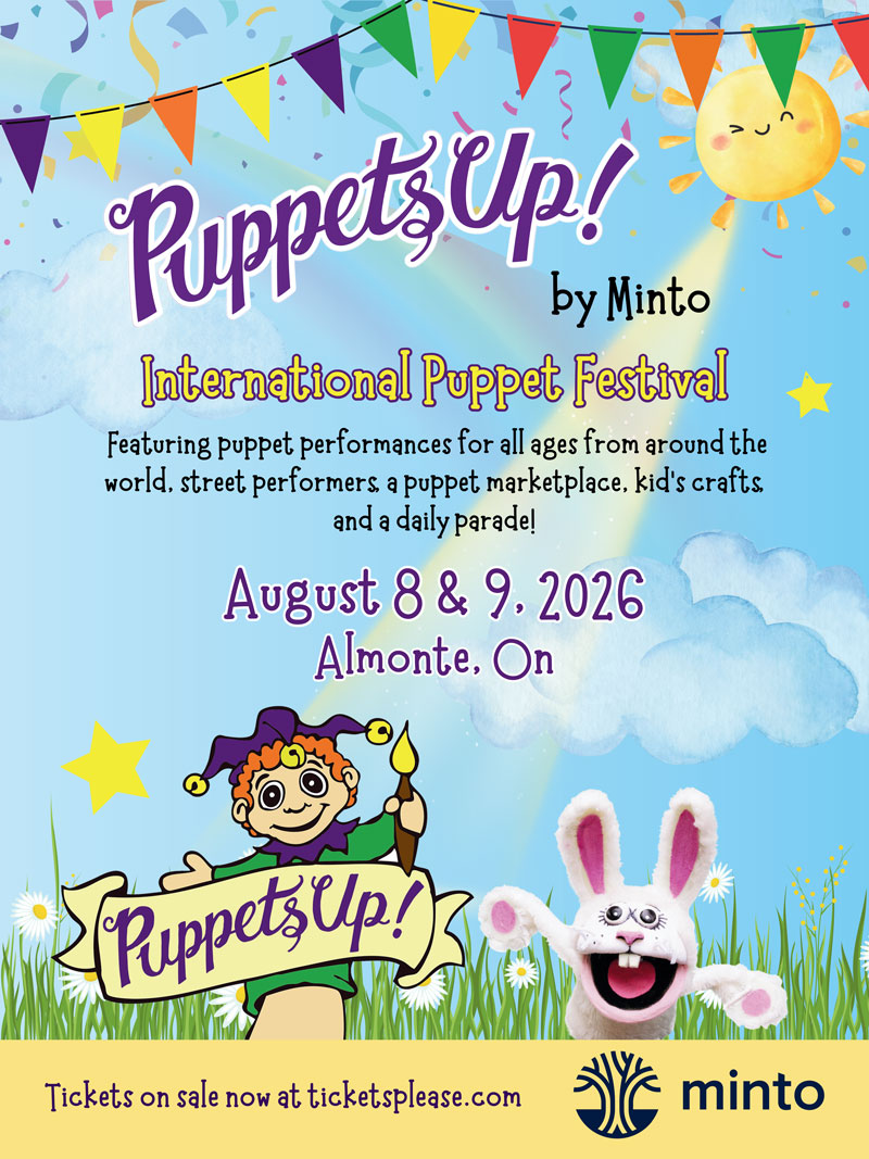 On August 8 and 9, 2026, beautiful downtown Almonte comes alive as the stage for a magnificent puppet festival, with 7 theatres, multiple puppet troupes, and up to 70 performances plus daily parades, incredible street entertainment, a full marketplace, and a kids’ area with amazing activities and a craft tent.