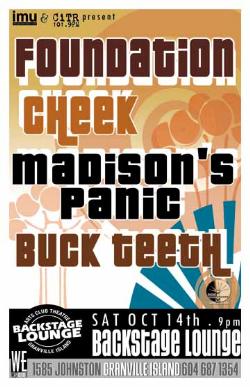 . Saturday, Oct 14th IMU & CiTR present Foundation, Cheek, Madison's Panic + Buck Teeth @ The BACKSTAGE LOUNGE, 1585 Johnston Street, Granville Island . 9pm / $10